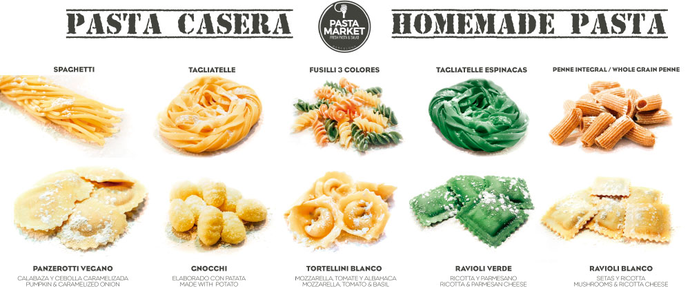 Pasta Market es un restaurante italiano situado en el centro de Barcelona. En él, podrás personalizar tu plato de pasta con nuestra gran variedad de salsas e ingredientes. Para terminar tu comida, disponemos de postres caseros entre los cuales están: tiramisú, panna cotta y gelatto affogato. En el caso de que quieras disfrutar tu comida en casa, disponemos de servicio take-away para que la puedas llevar.